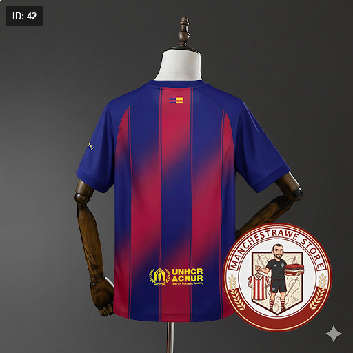 🔵 يتبع ألوان برشلونة التقليدية (أزرق وأحمر) لكنه بلمسة تصميم حديث مع تدرجات لونية تضيف حركة وحيوية للخطوط مما يعطي القميص طابع ديناميكي وعصري.  ⚽ اسم FC Barcelona مطبوع داخل ياقة القميص وتفاصيل صغيرة تجمع بين علم برشلونة وعلم كتالونيا خلف الرقبة تضيف لمسة هوية للنادي.  👕 شعار الراعي Spotify وشعار Nike مطبوعان على الصدر بجودة عالية مع تفاصيل إضافية حسب النسخة (مثل شعارات أخرى في بعض الإصدارات).  🌬️ مصنوع من خامة خفيفة وقابلة للتهوية غالبًا مع تقنية Nike Dri-FIT التي تساعد على إبقاء الجسم جافًا ومريحًا أثناء الحركة.  👣 تصميم يناسب الاستخدام اليومي والرياضي مع خامات مرنة وقماش يمتص العرق ويحسن من الراحة أثناء النشاط.  🔁 القميص يحمل تفاصيل تراثية وحديثة في نفس الوقت، ما يجعله قطعة أنيقة تعبر عن هوية النادي وتاريخه العريق